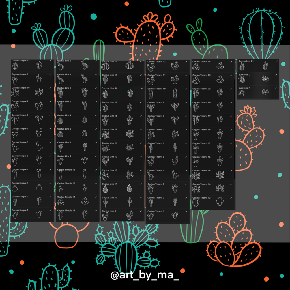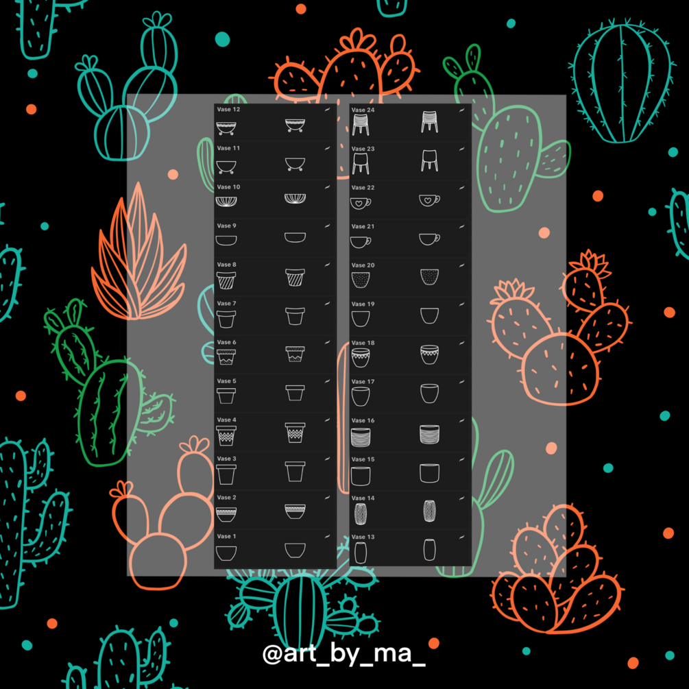 In this pack you will get 63 cactus brushes for Procreate divided in three different styles: Simple, Lines and Thorns + 24 vases!