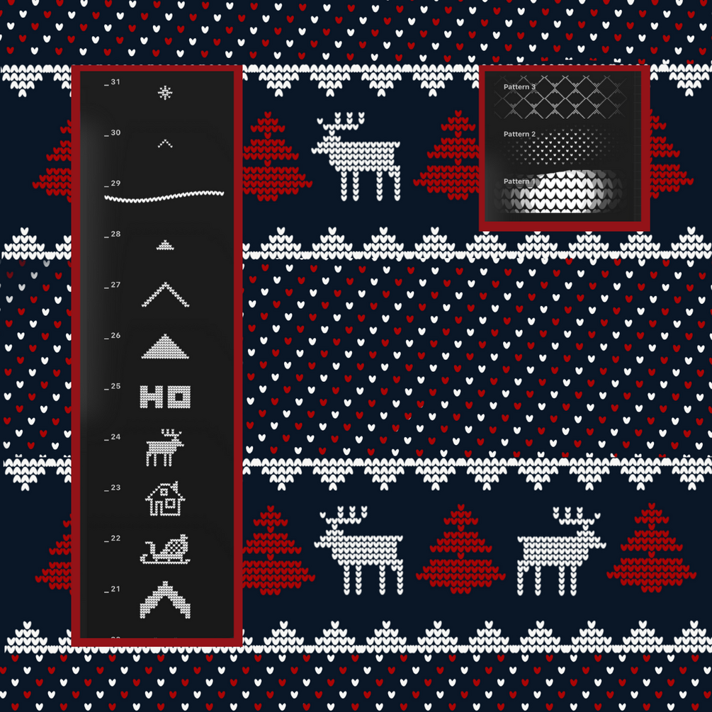 - Classic Christmas motifs: snowflakes, reindeers, trees, stars, hearts & geometric sweater patterns