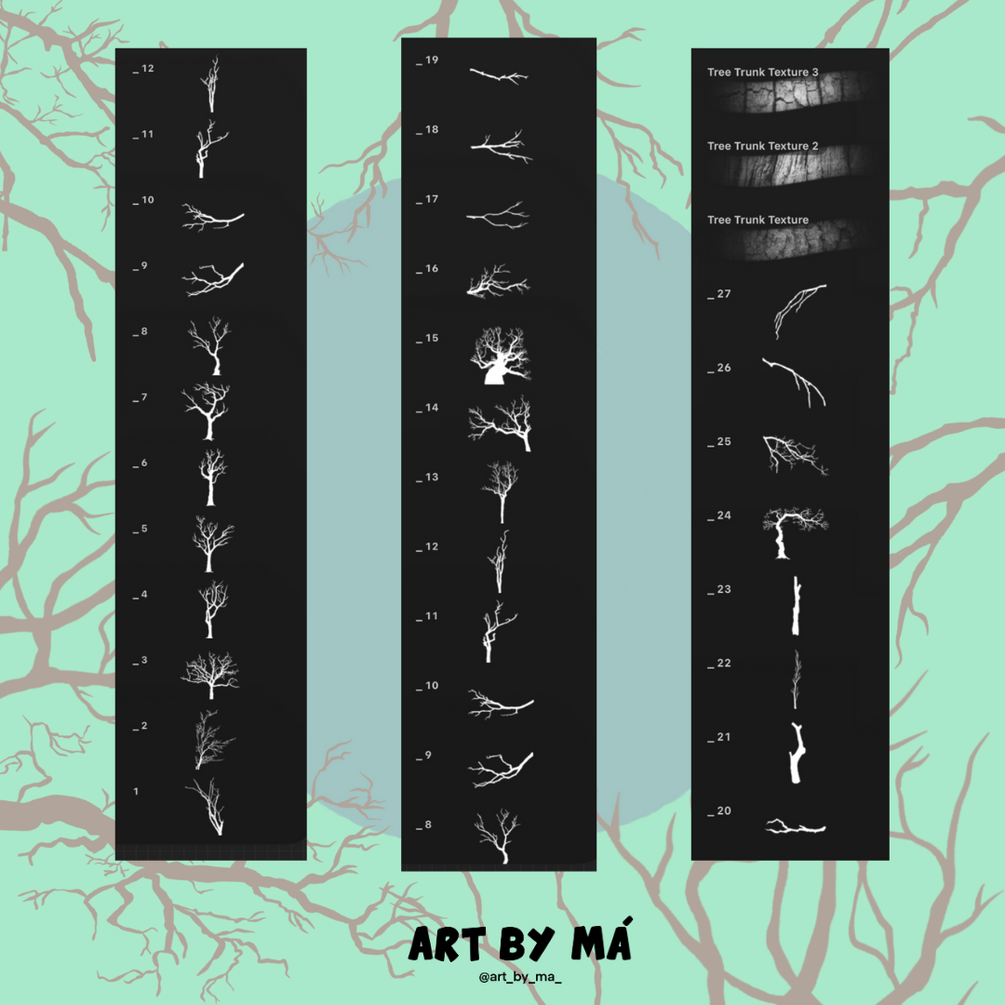 This pack includes 27 handmade tree and branch stamps plus 3 bonus texture brushes for realistic bark and wood details.